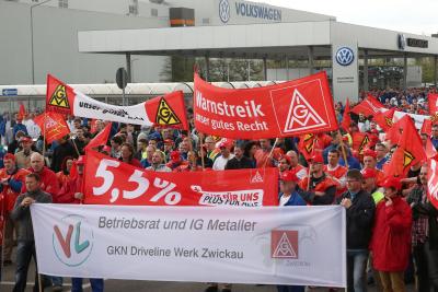 VW workers staged a several-hour “warning strike” in Zwickau, Germany, on May 13, demanding a 5.5 percent raise. German plants have a dual representation system with both a union, which can strike, and a works council, which is pledged not to. The United Auto Workers have asked VW to agree to a similar set-up in Chattanooga, Tennessee. Photo: I. Pastierovic/IG Metall.