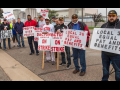 Three workers stand in front of a liquor store holding a banner that reads "This Store Too High a Price for Liquor"