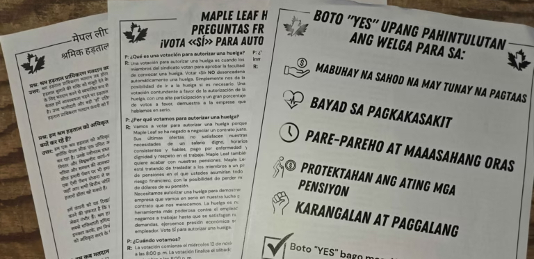 Rank-and-file members of UFCW Local 832 translated the union's strike authorization vote leaflet into Spanish, Punjabi, Tagalog, and other languages commonly spoken by workers at the Maple Leaf plant. The vast majority of workers there are immigrants. Photo courtesy of The North Star